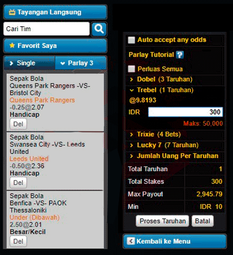 Dari contoh di atas, bisa kita lihat bahwa kita akan bet parlay di 3 partai yaitu: